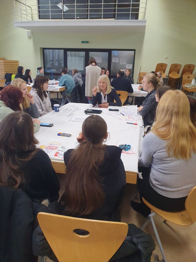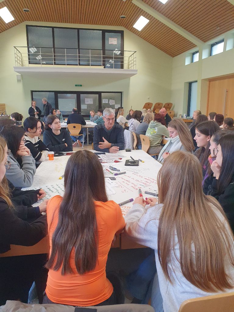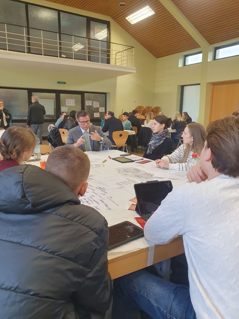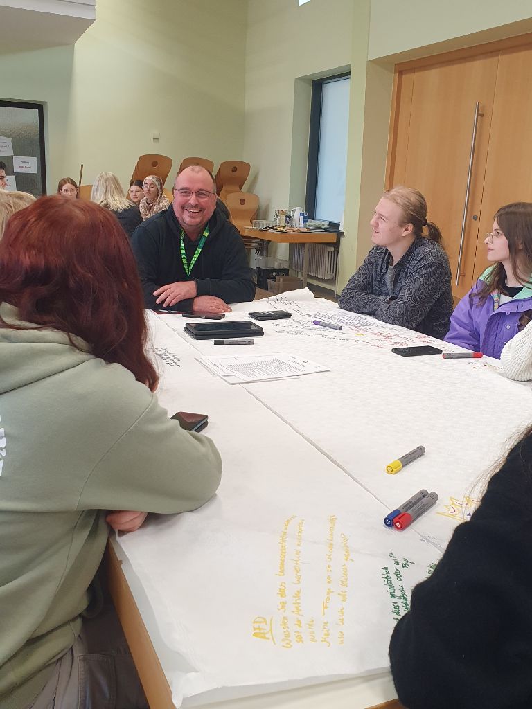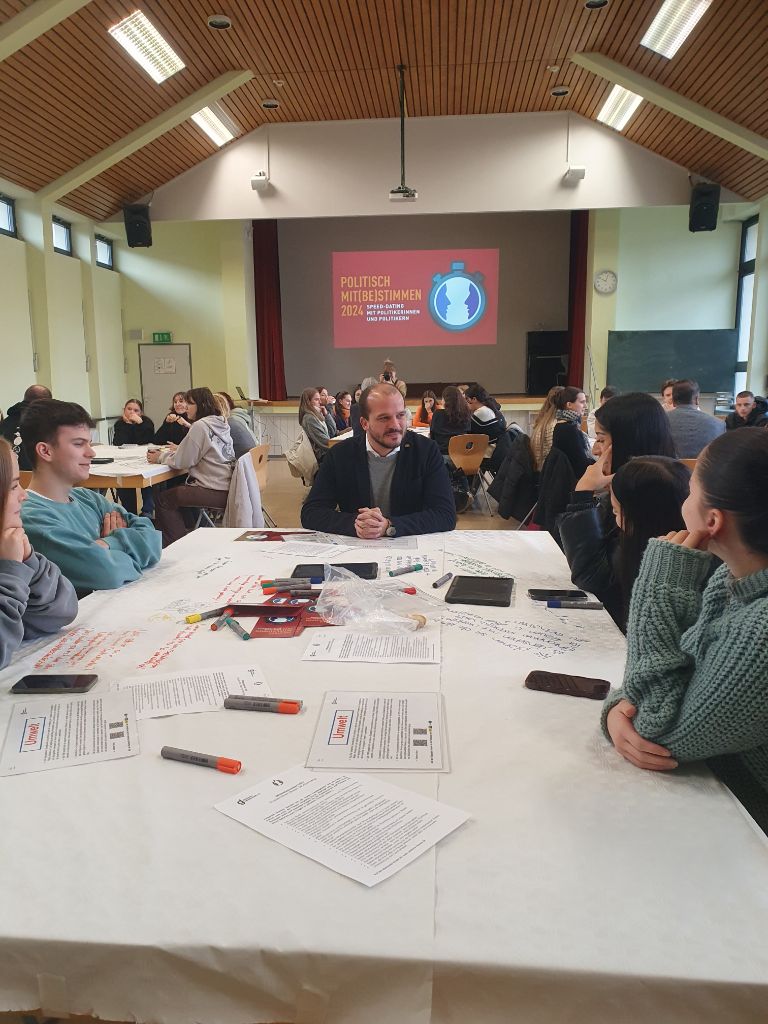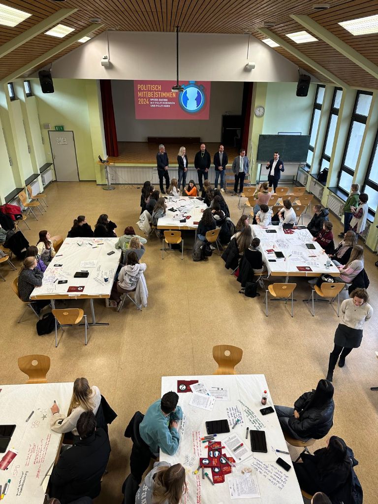 In einer Gruppenarbeitsphase erarbeiteten die Schüler*innen gezielte Fragen, die sie im Anschluss im Speed-Dating-Format direkt an die anwesenden Politiker*innen stellen konnten. Im Mittelpunkt stand der persönliche Austausch – eine seltene Gelegenheit, um konkrete Anliegen und Meinungen mit politisch Aktiven zu diskutieren.