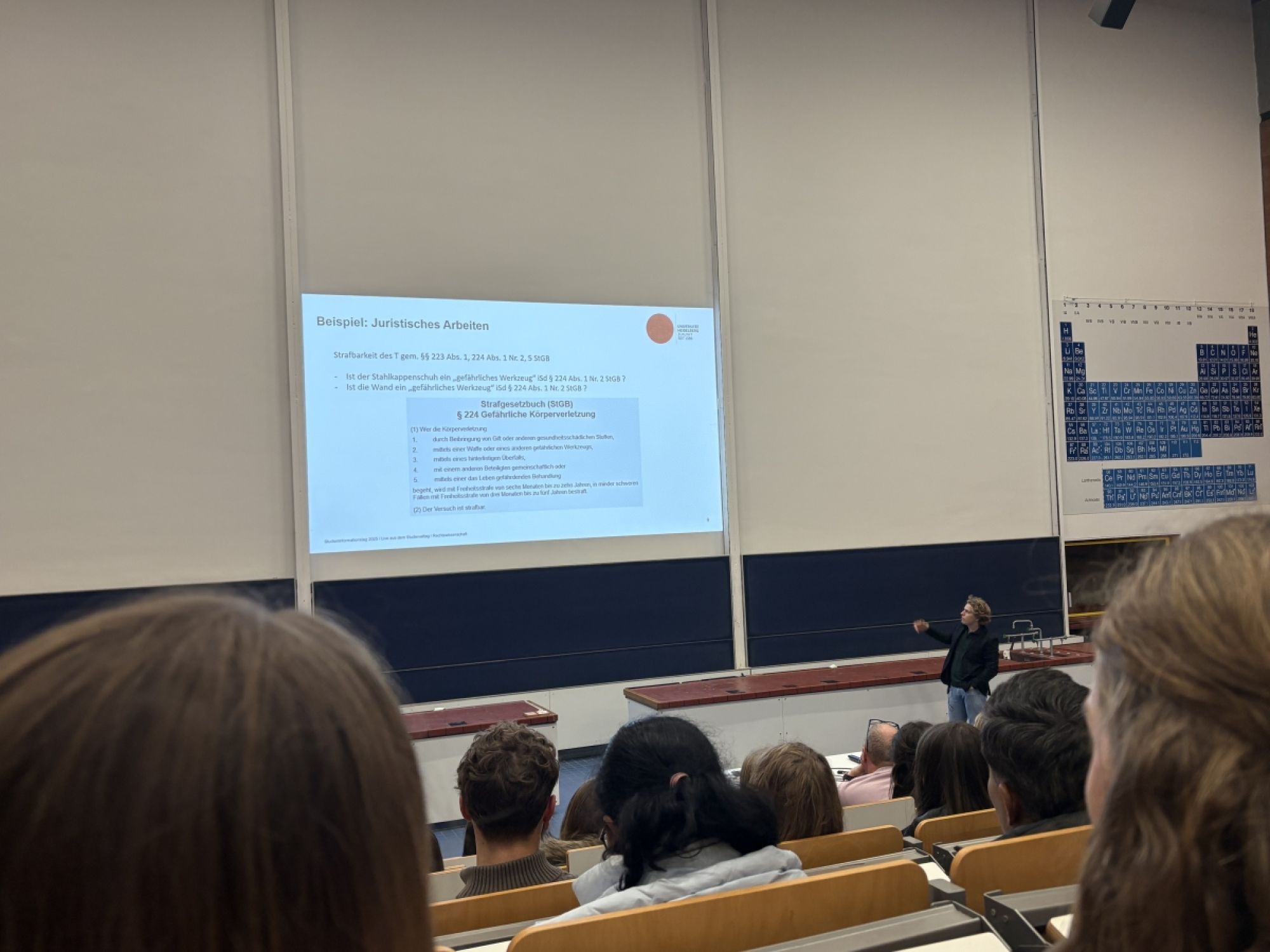 Hala Jabban: In der Jura-Vorlesung der Universität zu Heidelberg haben wir einen kurzen Fall besprochen und selbst versucht, ihn mithilfe von Paragraphen zu lösen. Außerdem wurde uns erklärt, wie juristisches Arbeiten funktioniert und wie ein typischer Studienalltag aussieht.