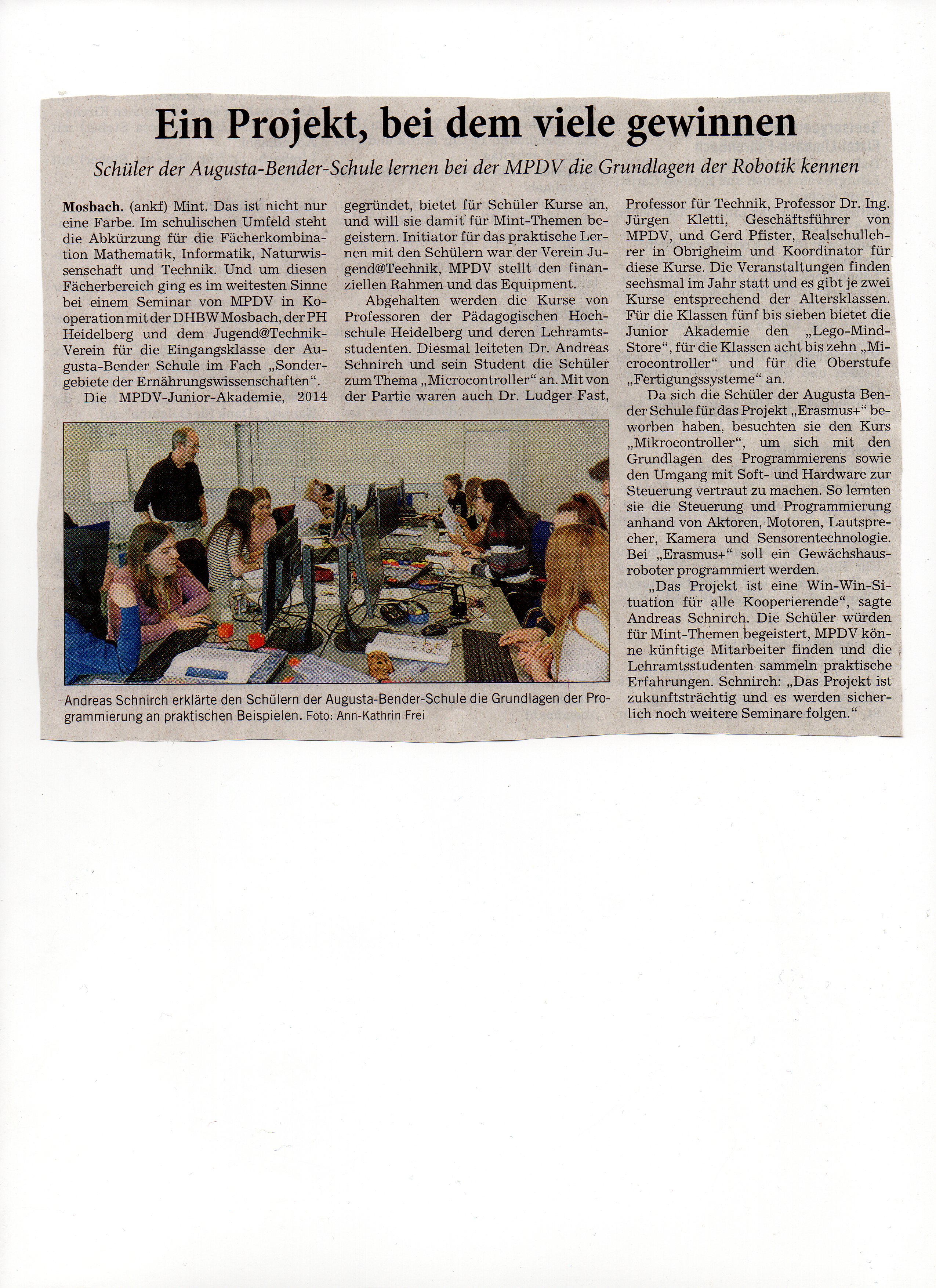 Die Augusta-Bender-Schule in Mosbach ist nicht mehr „nur“ „MINT-freundliche Schule“, sondern jetzt auch „Digitale Schule“. Dabei handelt es sich um Schulen, die sich in besonderem Maße im Bereich der digitalen Bildung engagieren. Nähere Informationen entnehmen Sie bitte dem folgenden Artikel: