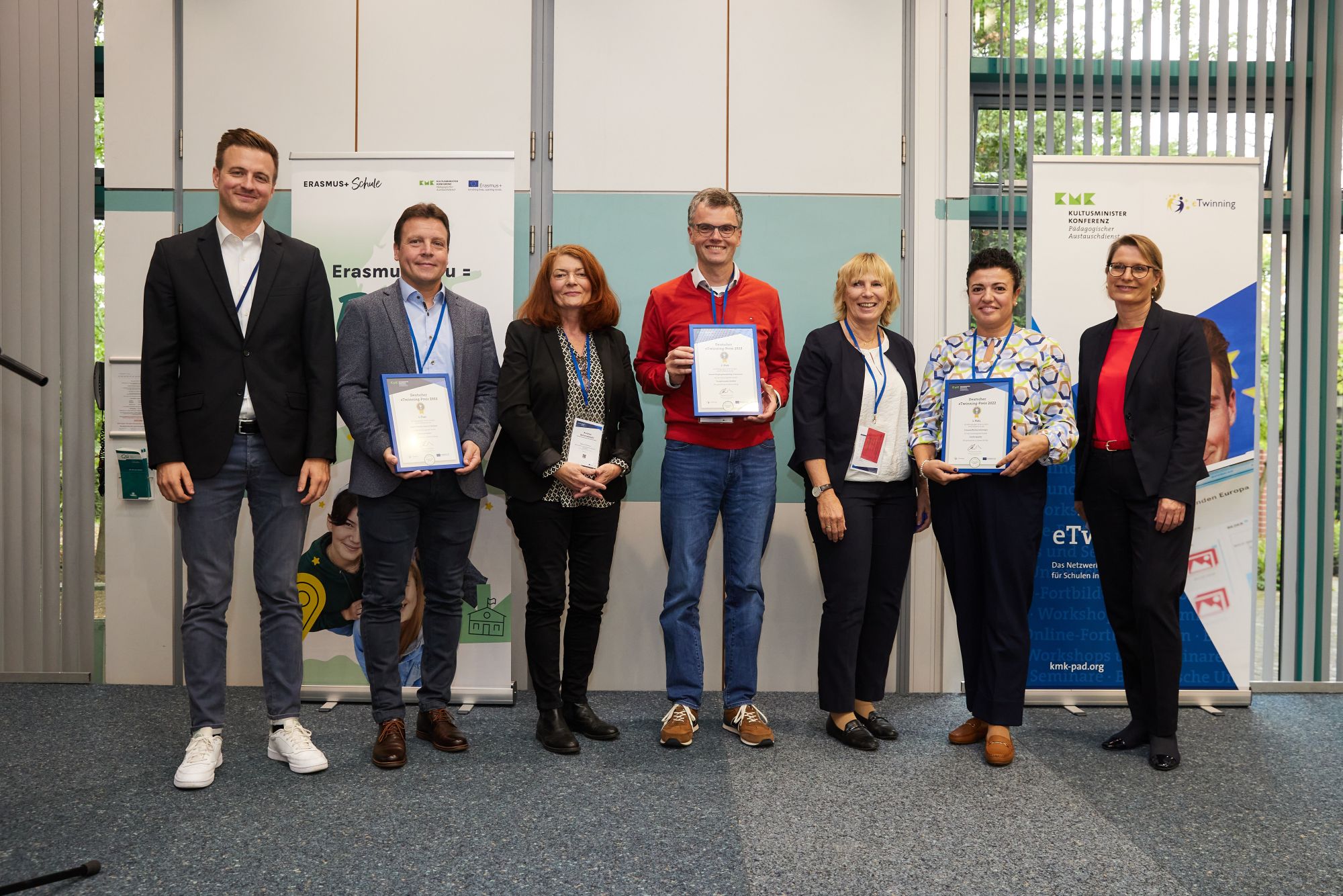 Dr. Stefanie Hubig, Ministerin für Bildung des Landes Rheinland-Pfalz (rechts) mit den Gewinnern des Deutschen eTwinning-Preises. Von links: Matthias Tietze (Augusta-Bender-Schule Mosbach), Michael Kunzmann (Schulleiter Augusta-Bender-Schule Mosbach), Andrea Schendekehl und Stefan Koböke (beide Konrad-Klepping-Berufskolleg Dortmund), Gabriela Ruhe und Samira Lokvancic-Hajric (beide Eichendorffschule Schöningen) Bildautor: Marcus Gloger